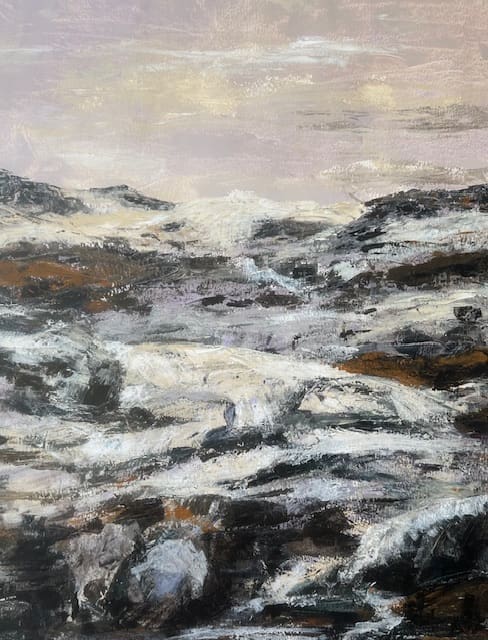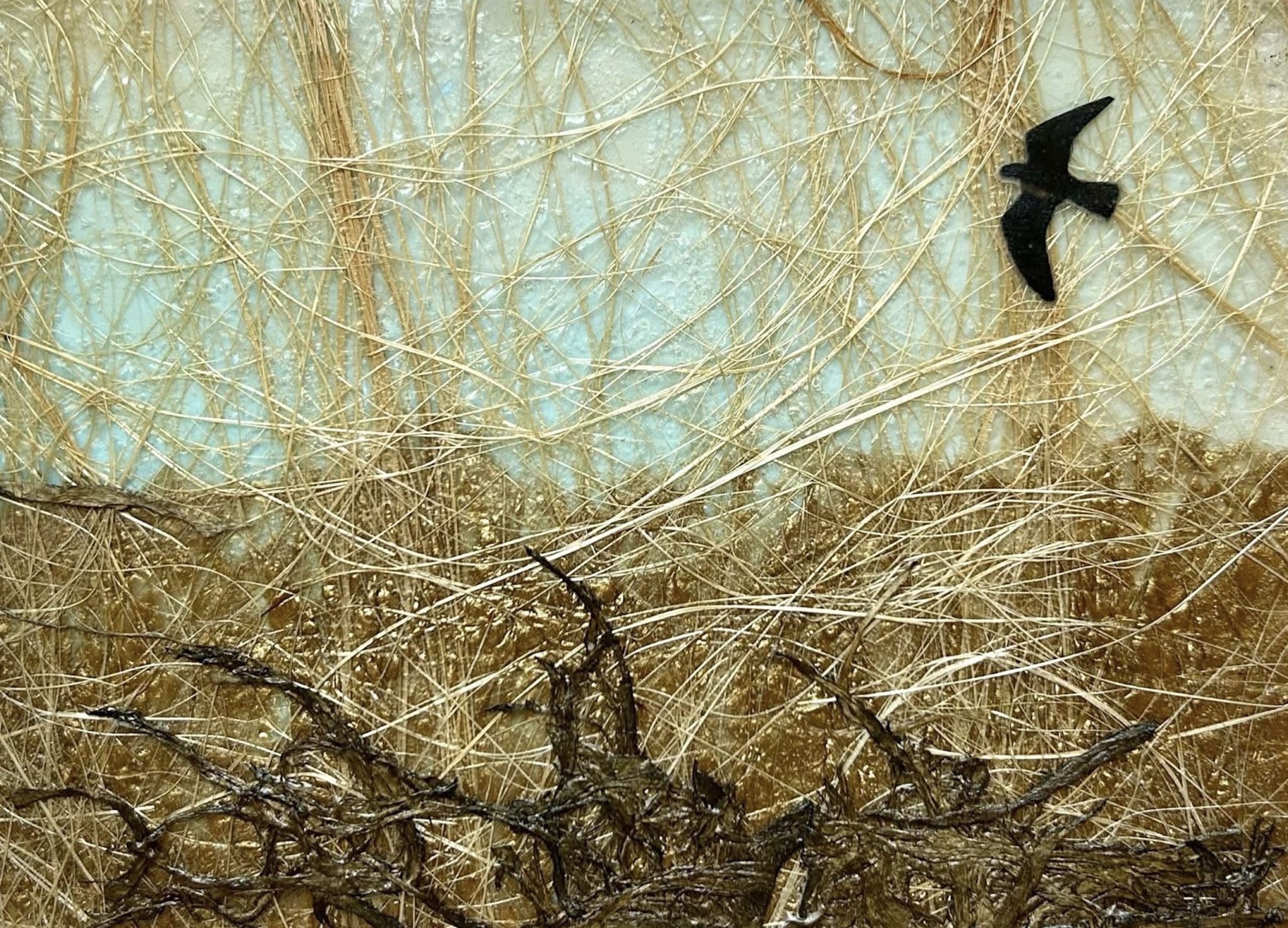 However, having lived in California for almost 20 years, I grew to love the sparse desert landscape and the beauty of her coast and farmlands.  I took workshops that focused on acrylic, collage, and monotype printmaking.  From those experiences, my landscapes, abstracts, or non-representational paintings developed from how I experience nature and organic forms.  My acrylic works, which are mostly abstract or non-objective, are typically based on nature or music that inspires me and may include collaged materials.  I have recently begun to use pastels to capture birds and nature.