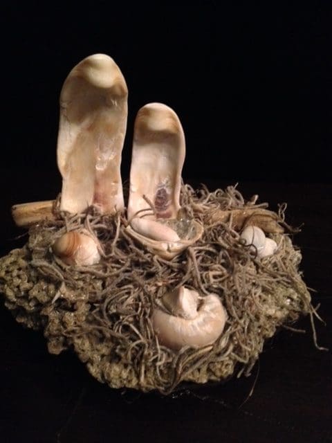 The shells and driftwood on the Carolina beaches inspire me to make shell sculptures with the materials that I find on the beaches.  I use the shapes within the shells to represent figures and animals that speak to me of ancient times.   I hope that my art moves the viewer to truth and joy.