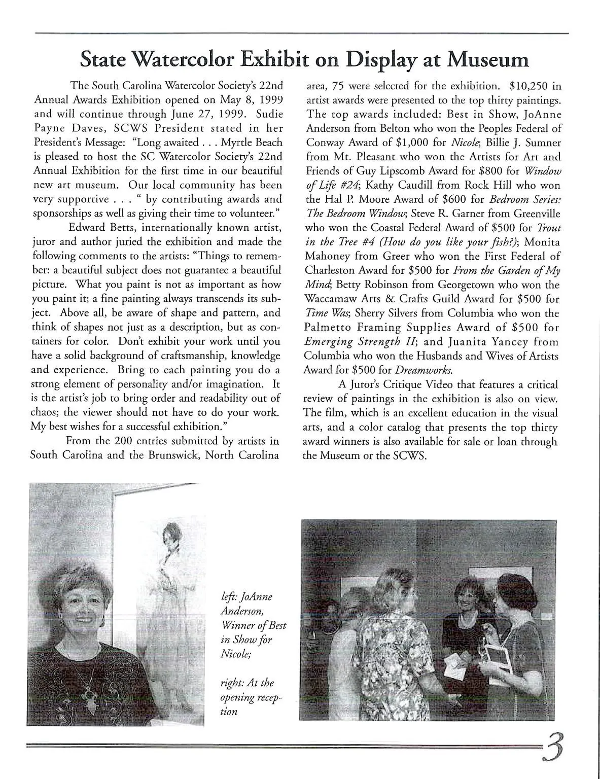 “While researching history of the Museum for our 100 celebration of the Villa, I uncovered an old newsletter called the Villa Voice, Volume 3, Issue 1, May/June 1999 – an article about the SCWS show at the Museum in 1999.  See below for the article. In light of the fact that the 2024 exhibition will be held in Myrtle Beach, this was a fun bit of history to learn!”